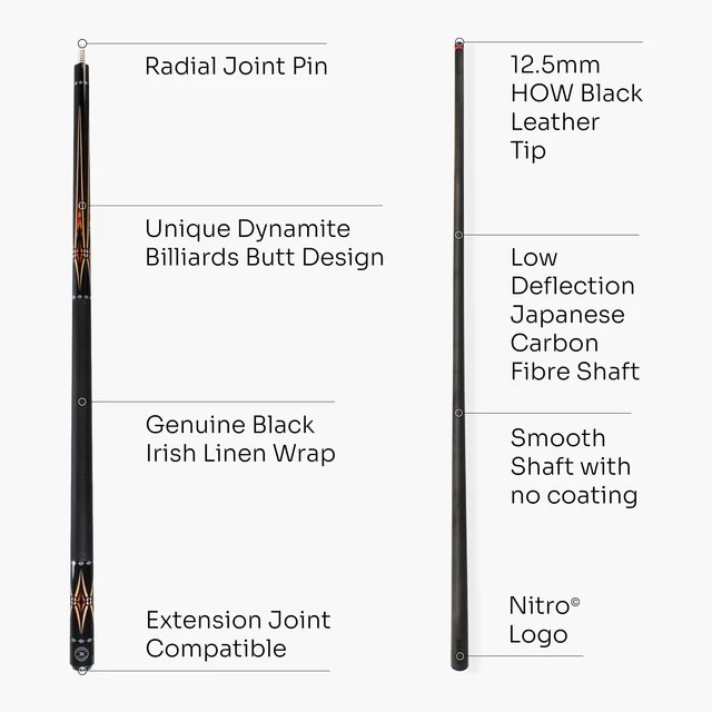 - Stiff tapered Nitro Carbon Fiber shaft with low deflection – makes it easier to pot balls with sidespin and control the cue ball